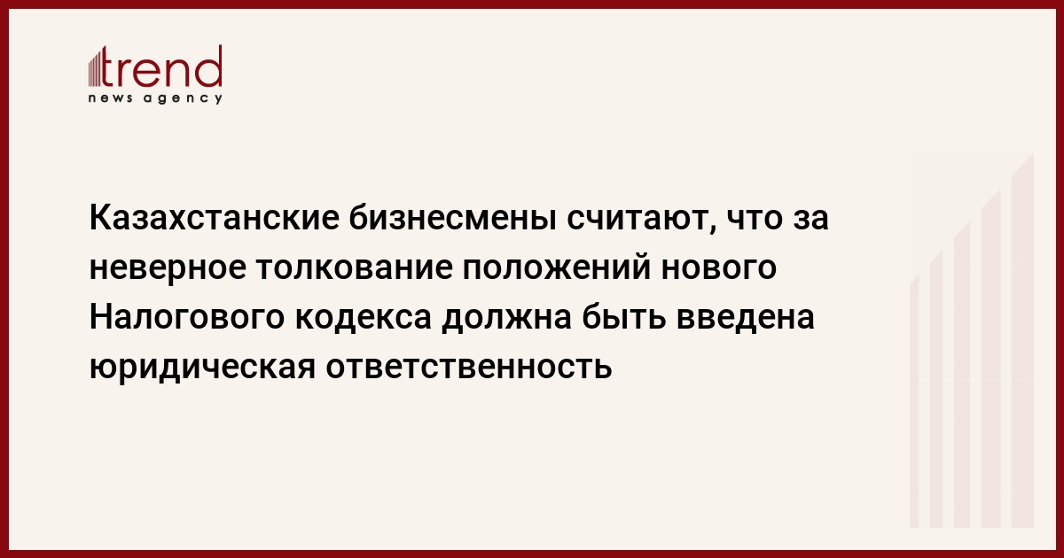 Казахстан, Астана, 15 сентября /корр. Trend К. Конырова/ Представители частного бизнеса считают, что в Казахстане должна быть введена ответственность за неверное толкование положений нового Налогового кодекса, сообщает собкор Trend в Астане.