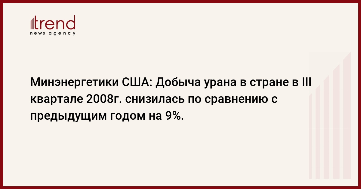 Добыча урана в США в III квартале 2008г. снизилась по сравнению с предыдущим годом на 9%, сообщает Министерство энергетики этой страны. Так, в III квартале с.г. в США было добыто 980,933 тыс. фунтов (порядка 444,9 т) концентрата оксида урана U3O8. Для сравнения, в III квартале 2007г. этот же показатель составил 1,08 млн фунтов (порядка 489,9 т). За первые девять месяцев 2008г. добыча в США урана U3O8 составила 2,9 млн фунтов (порядка 1,315 тыс. т). По сравнению с аналогичным периодом предыдущего года его добыча упала с 3,3 млн фунтов (порядка 1,497 тыс. т) на 15%. Поставки урана в III квартале осуществлялись с семи рудников: White Mesa (штат Юта); Alta Mesa (штат Техас); Crow Butte (штат Небраска); Kingsville Dome, Vasquez и Rosita (все три объекта в штате Техас); Smith Ranch-Highland (штат Вайоминг). Рудник Rosita в штате Техас в III квартале с.г. возобновил добычу урана впервые после девятилетнего перерыва. Так, добыча урана на этом объекте была приостановлена в 1999г., отмечено в докладе Министерства энергетики США, передает РБК.