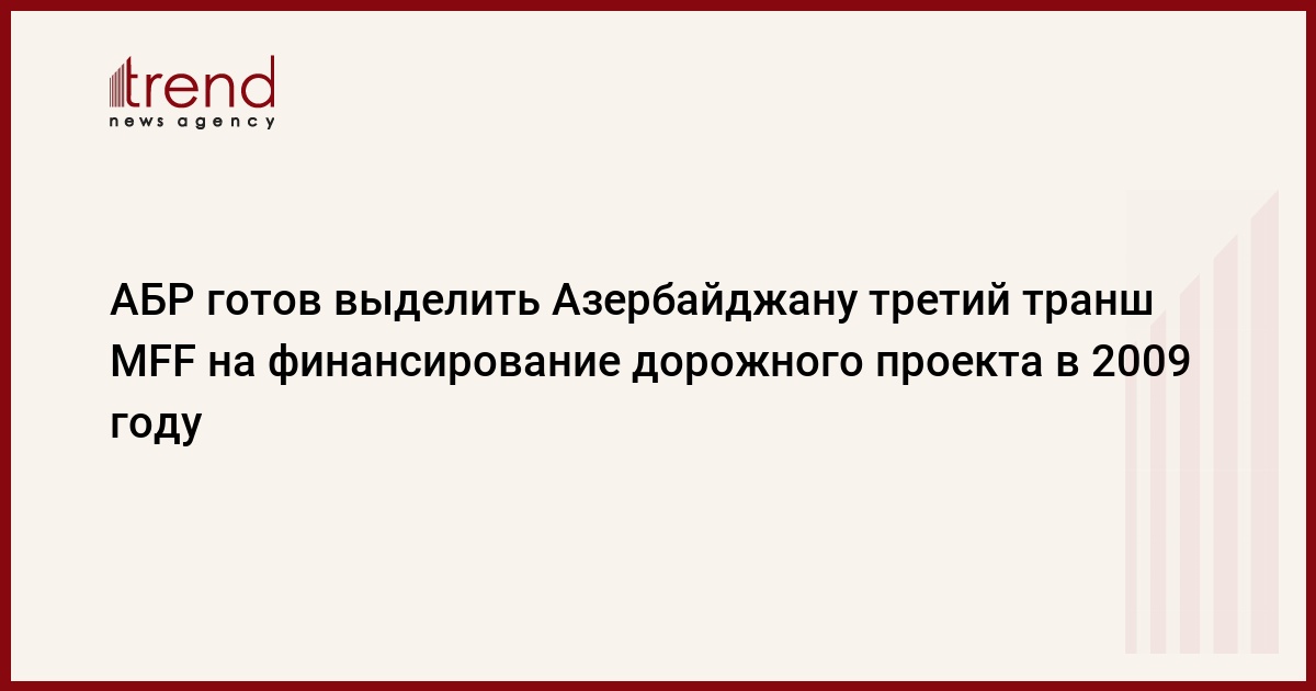 Азербайджан, Баку, 19 ноября /корр. Trend И.Халилова/ Азиатский банк развития (АБР) готов профинансировать модернизацию участка восточно-западной магистрали - автомобильной дороги Гянджа-Газах, в рамках мультитраншевого пакета (Multitranche Financing Facility - MFF) для дорожных проектов в Азербайджане, утвержденного в размере 500 миллионов долларов в августе 2007 года, сказали в среду в правительстве.