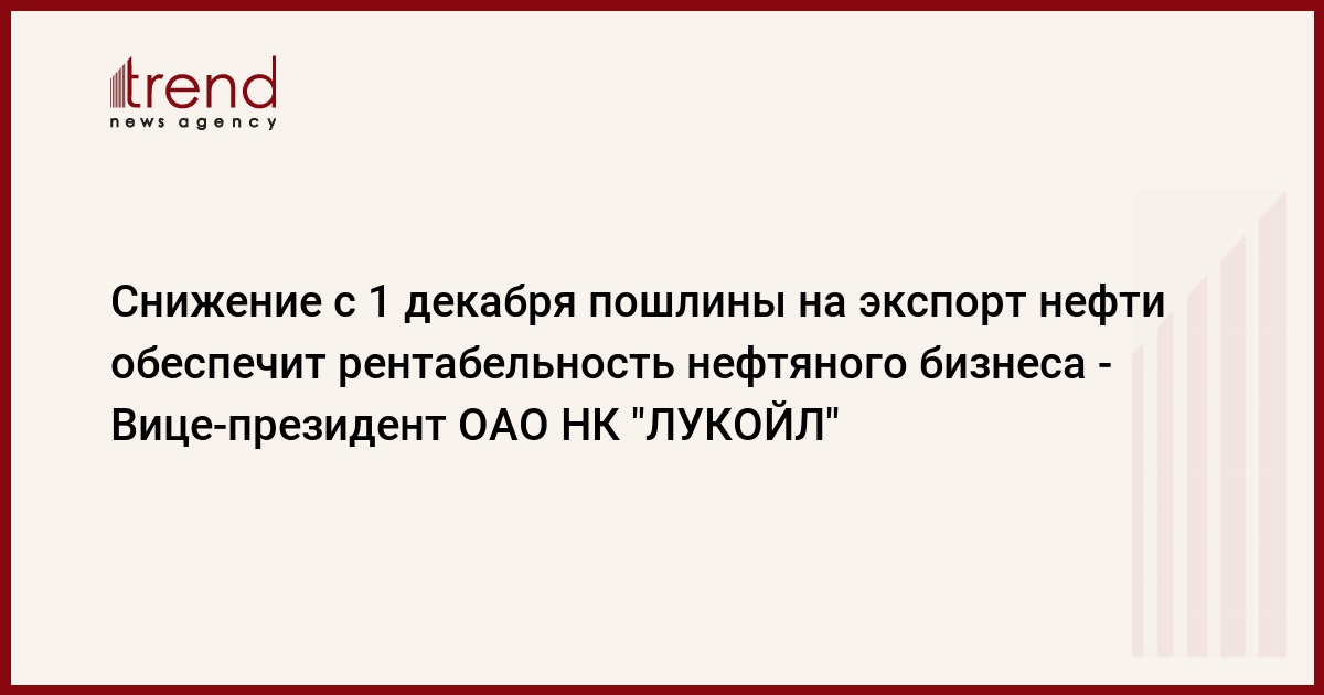 Вице-президент ОАО НК "ЛУКОЙЛ" Леонид Федун считает, что снижение с 1 декабря 2008г. налоговой пошлины на экспорт нефти поможет нефтяному бизнесу, обеспечив нормальный режим функционирования. Такое мнение он высказал в интервью телеканалу "Вести". "До сегодняшнего дня каждая тонна экспортируемой нефти приносила 40 долл. убытка. Налоги рассчитаны из цены 80 долл. за баррель. Мы не можем долго торговать в убыток. С 1 декабря перейдем в нормальный режим функционирования, будет прибыль, это несколько долларов, но это прибыль", - отметил он, передает РБК.
