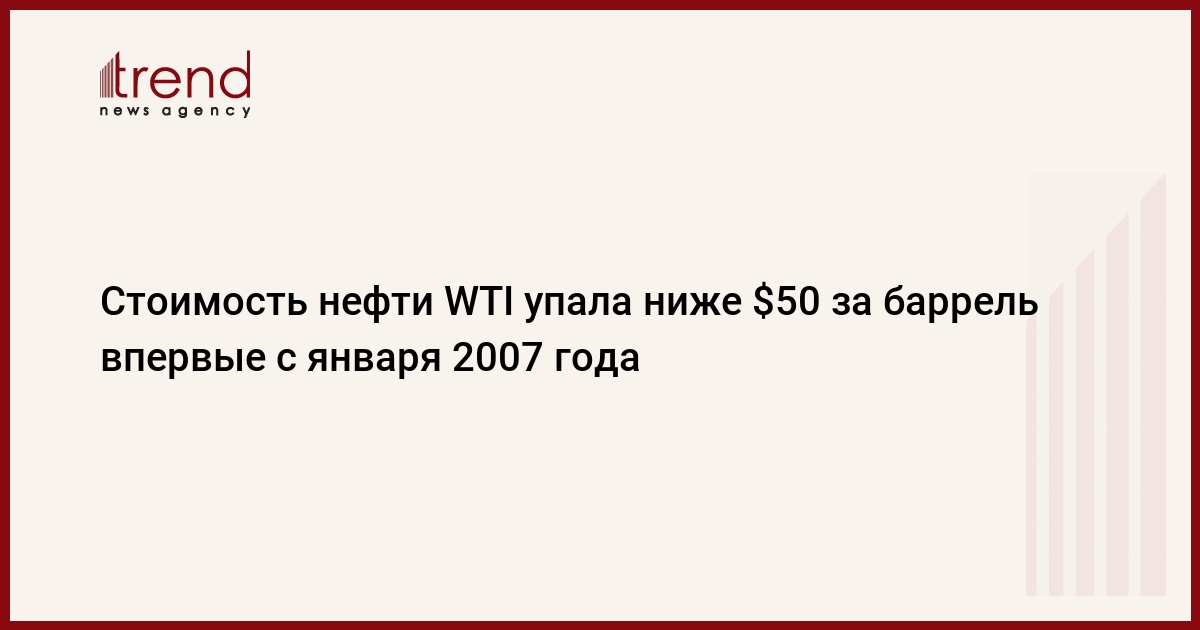 Стоимость нефти WTI на Нью-йоркской товарной бирже (NYMEX) упала в четверг ниже $50 за баррель впервые с января 2007 г. на фоне рецессии в США, Европе и Японии, способствующей сокращению спроса на топливо, сообщает "Интерфакс", ссылаясь на агентство Bloomberg.