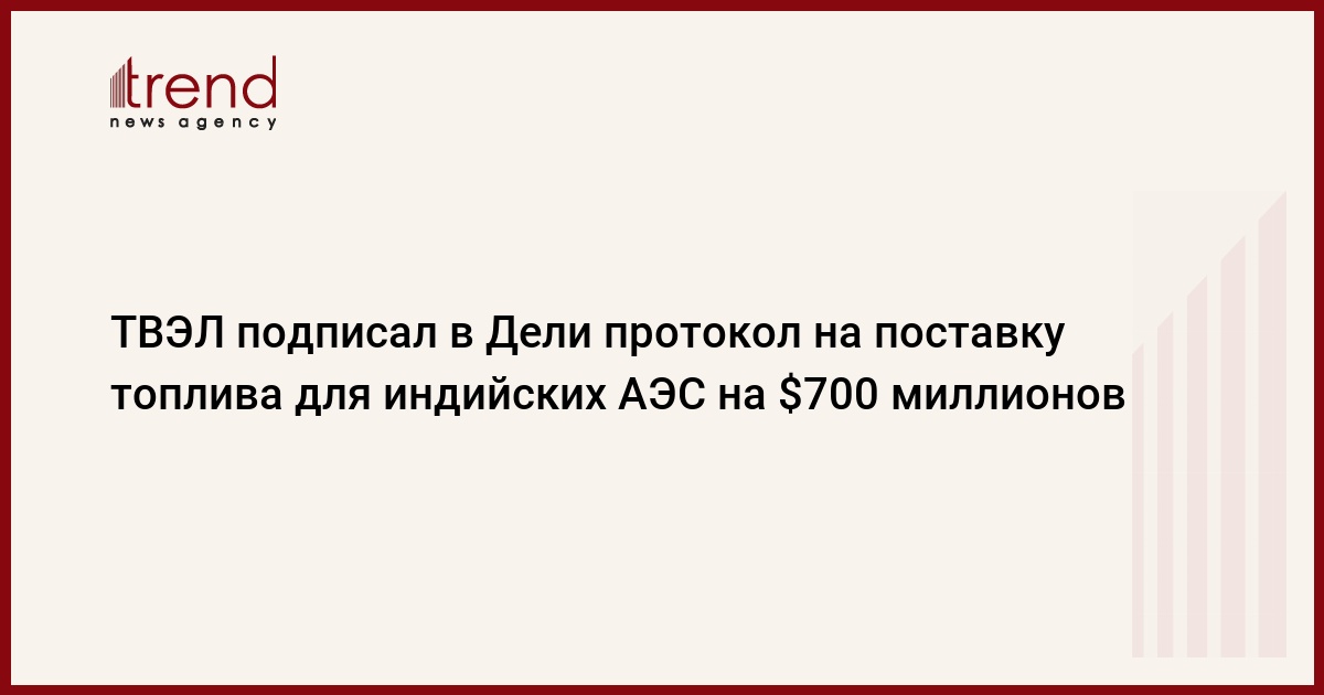 Корпорация "ТВЭЛ" подписала в пятницу в Дели с индийской Национальной корпорацией по атомной энергии протокол на поставку топлива для индийских атомных электростанций на сумму в $700 миллионов.