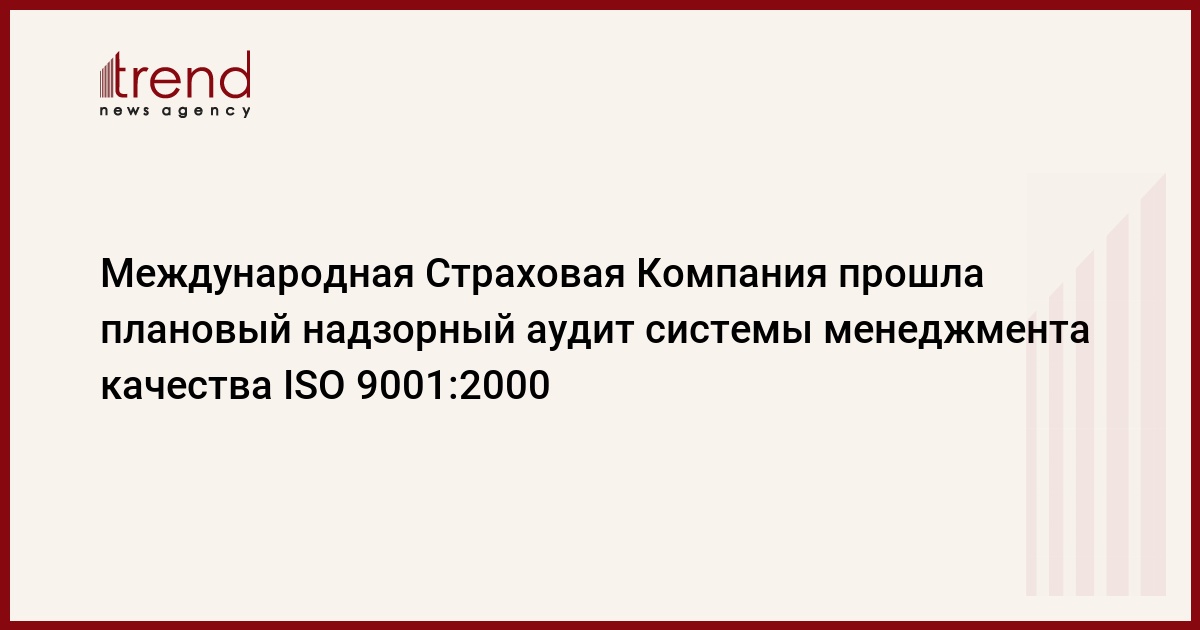 Азербайджан, Баку, 10 декабря / Trend / Международная Страховая Компания прошла плановый надзорный аудит системы менеджмента качества (СМК) - ISO 9001:2000, сообщили в среду в компании.
