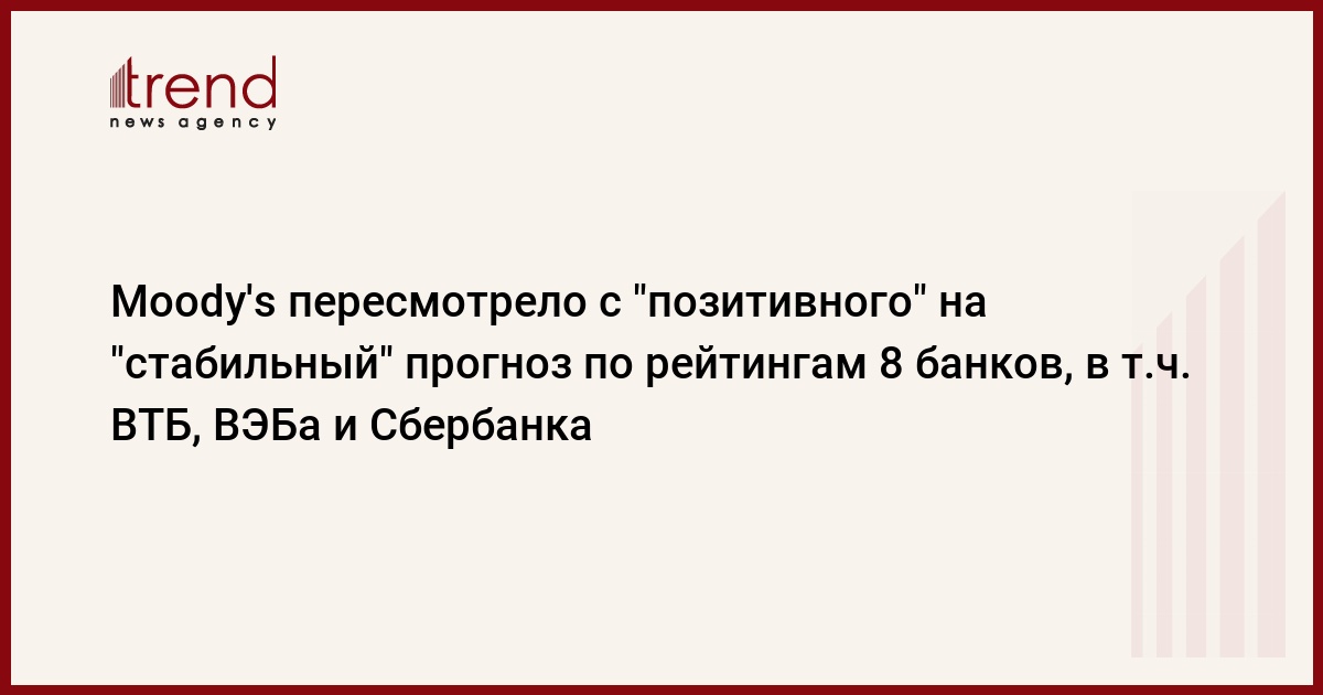 Международное рейтинговое агентство Moody's Investors Service пересмотрело прогноз по рейтингам 8 российских банков с государственным участием с "позитивного" на "стабильный", говорится в распространенном сегодня сообщении агентства, пишет РБК. Прогноз был пересмотрен по рейтингам Сбербанка, банка ВТБ, банка "ВТБ Северо-Запад", ВТБ-24, Банка Москвы, Россельхозбанка, Газпромбанка и Внешэкономбанка (ВЭБ).
