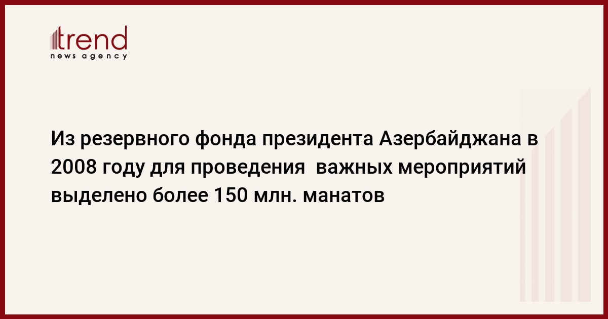 В 2008 году из резервного фонда президента Азербайджана для финансирования важных мероприятий было выделено 154 миллиона манатов, сказал министр финансов Самир Шарифов на заседании Кабинета министров, посвященном социально-экономическим итогам 2008 года и проведенном под председательством президента Азербайджана Ильхама Алиева.