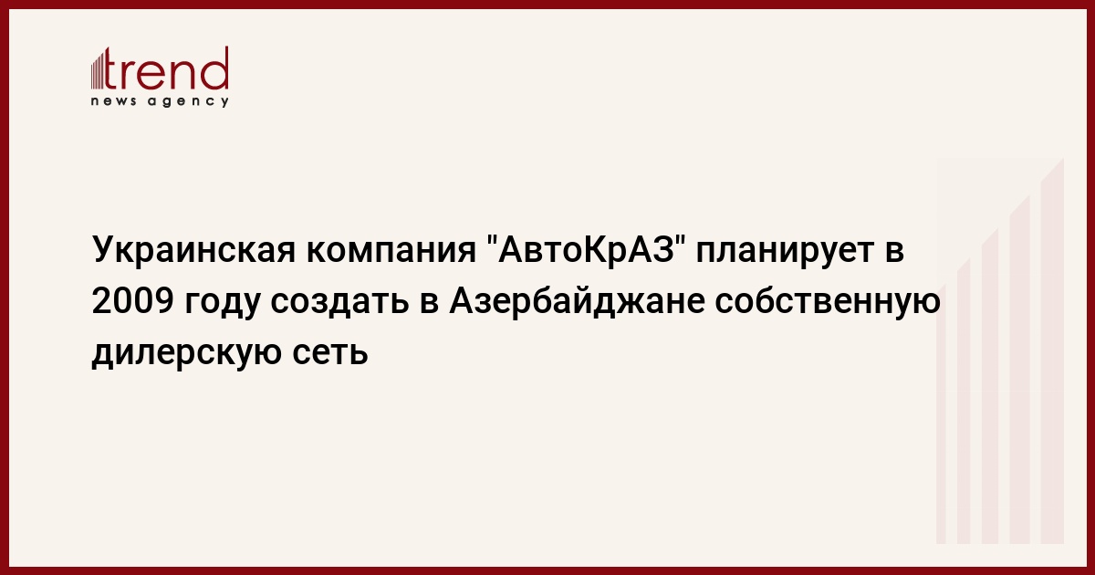 Украина, Киев, 20 января /корр. Trend З.Новсвитский/ Украинская компания "АвтоКрАЗ" планирует в 2009 году создать в Азербайджане собственную дилерскую сеть. Об этом сообщил журналистам заместитель генерального директора холдинга по внешнеэкономической деятельности Игорь Фоменко.