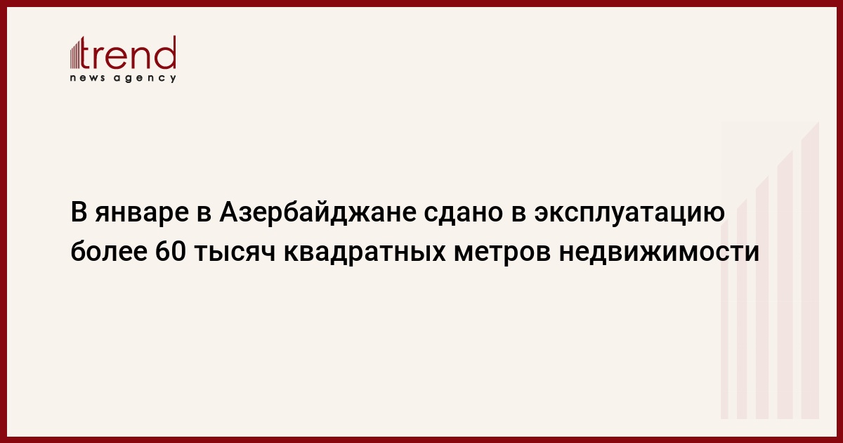 В январе в Азербайджане сдано в эксплуатацию 63,5 тысяч квадратных метров недвижимого имущества, что на 81 процент больше показателей аналогичного периода 2008 года, сообщили в четверг в Госкомитете по статистике Азербайджана.