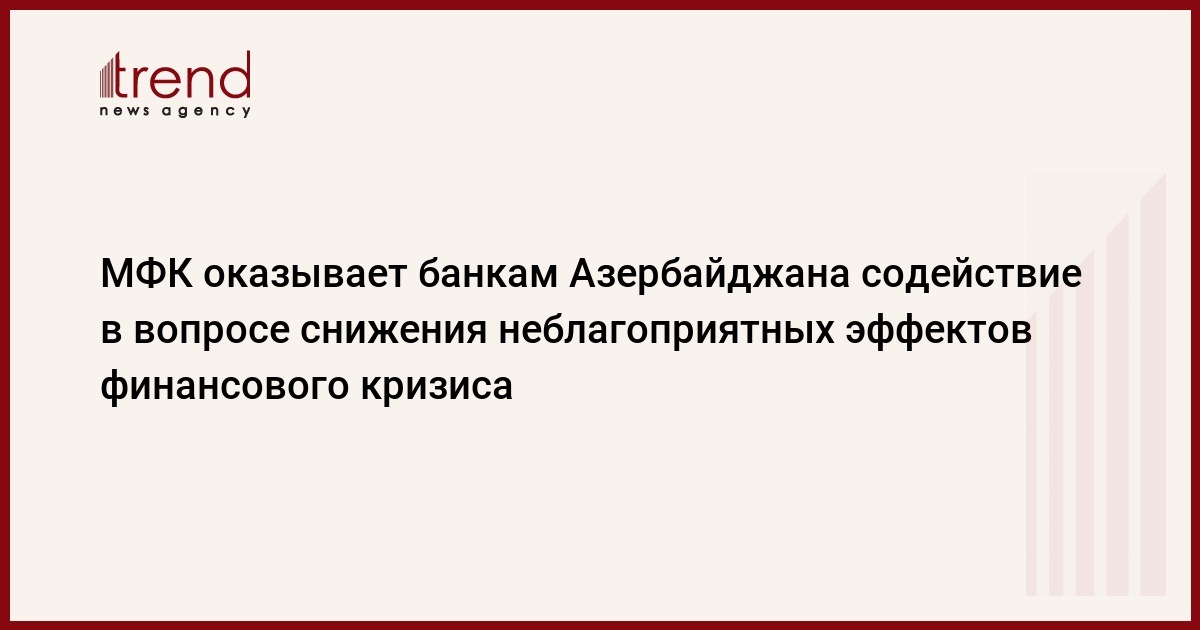 Международная финансовая корпорация (МФК) - член группы Всемирного банка, оказывает содействие в обучении банков и микрофинансовых организаций Азербайджана предупреждению и снижению неблагоприятных эффектов финансового кризиса на банковский сектор страны, сказано в сообщении корпорации.