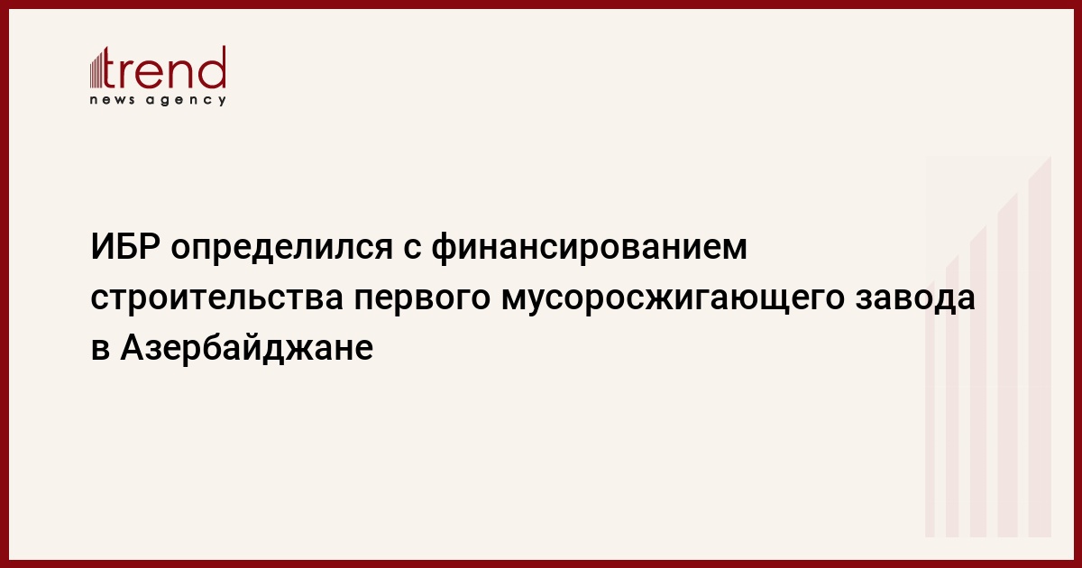 Исламский банк развития (ИБР) готов финансировать строительство первого завода по сжиганию бытовых отходов, мощностью в 500 тысяч тонн в Азербайджане, на что выделит 120 миллионов долларов, сказали в понедельник в правительстве страны.