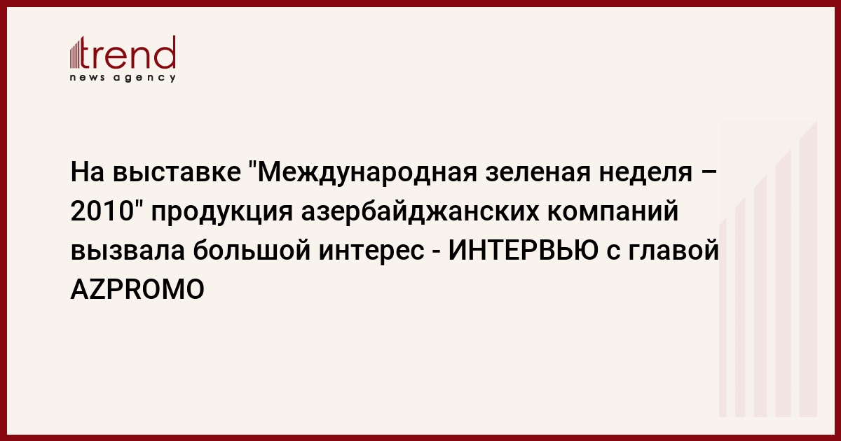 Азербайджан принял участие на 75-й юбилейной выставке "Международная зеленая неделя - 2010", проведенной в Берлине 15-24 января. На выставке, проводимой с 1926 года, представляются продукты сельского хозяйства и пищевой промышленности. В павильоне, выделенном для Азербайджана, при организации министерства экономического развития, были выставлены продукты питания и сельского хозяйства, производимые в стране.