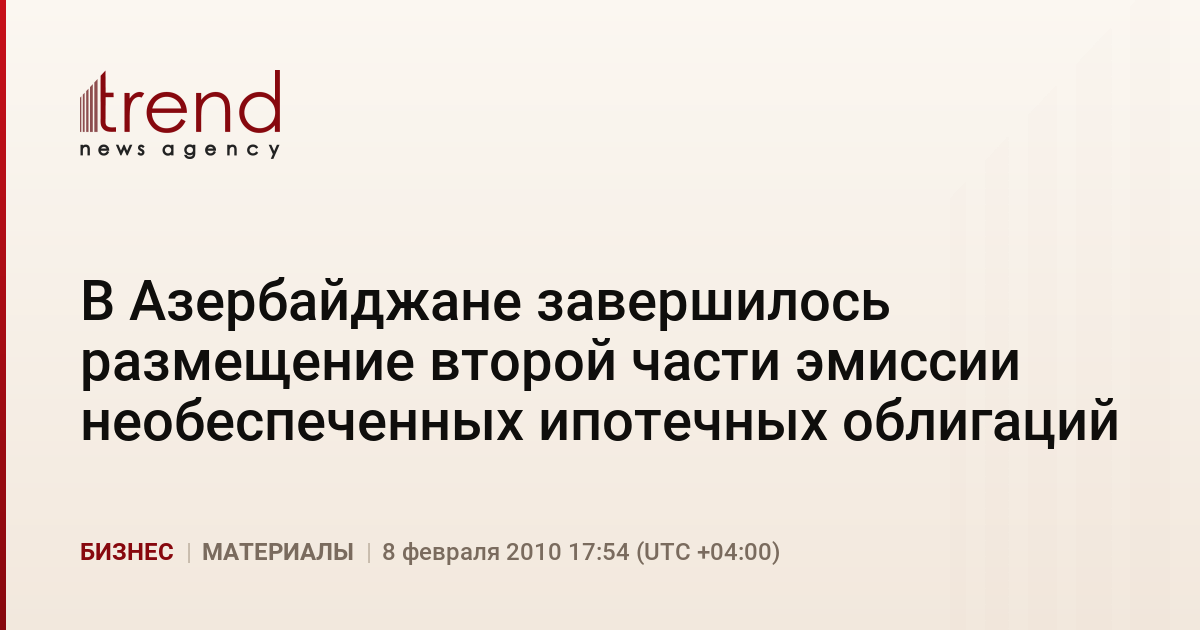 В Азербайджане завершилось размещение второй части эмиссии процентных, бездокументарных, необеспеченных, именных облигаций Азербайджанского ипотечного фонда (АИФ), действующего при Центральном банке страны, в размере трех миллионов манатов, говорится в сообщении Бакинской фондовой биржи (БФБ), распространенном в понедельник.