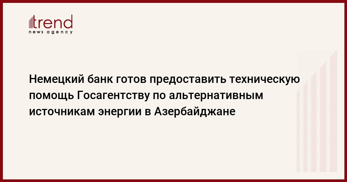 Германский банк развития KfW готов оказать техническую помощь Государственному агентству по альтернативным и возобновляемым источникам энергии при министерстве промышленности и энергетики, сказал во вторник глава бакинского офиса KfW Натик Абдуллаев.