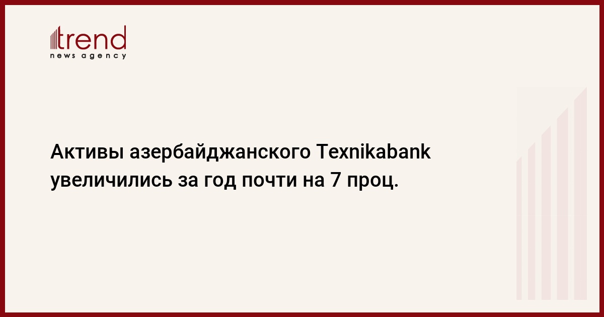 На первое февраля 2010 года активы азербайджанского Texnikabank, увеличившись по отношению к аналогичному периоду прошлого года на 6,78 процентов, составили 459,08 миллионов манатов, говорится в сообщении банка.