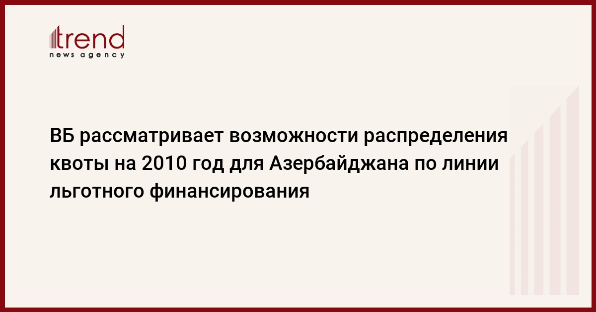 Всемирный банк рассматривает возможность финансирования за счет квоты Международной ассоциации развития (МАР входит в группу ВБ) для Азербайджана на 2010 финансовый год, реализацию двух проектов, сказали в понедельник в бакинском представительстве ВБ.