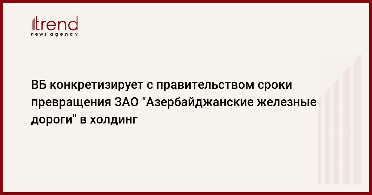 Утверждение кабинетом министров Азербайджана [от 15 февраля 2010 года] положения и структуры закрытого акционерного общества "Азербайджанские железные дороги" (Azerbaycan Demir yollari) ускорит процесс вступления в силу кредитного соглашения по проекту содействия транзиту по железной дороге и торговли Азербайджана, а также начала его реализации, сказали в понедельник в бакинском представительстве Всемирного банка (ВБ). Кредитное соглашение между ВБ и правительством Азербайджана было подписано 18 декабря 2009 года. Общая стоимость проекта составляет 673,8 миллиона долларов, из которых на кредит ВБ приходится 450 миллионов долларов.