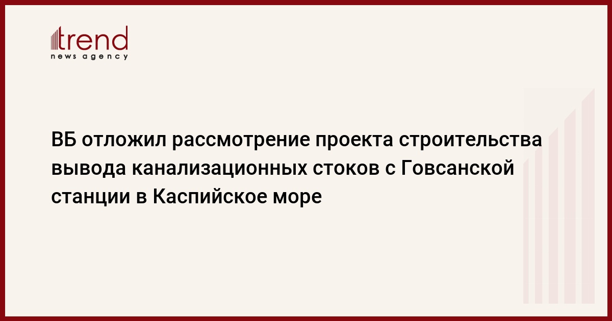 Проект строительства глубоководного вывода канализационных стоков с Говсанской станции аэрации в Каспийское море задерживается в связи с процессом переквалификации потенциальных поставщиков, сказал в четверг глава бакинского представительства Всемирного банка (ВБ) Грегори Йеджейчак.