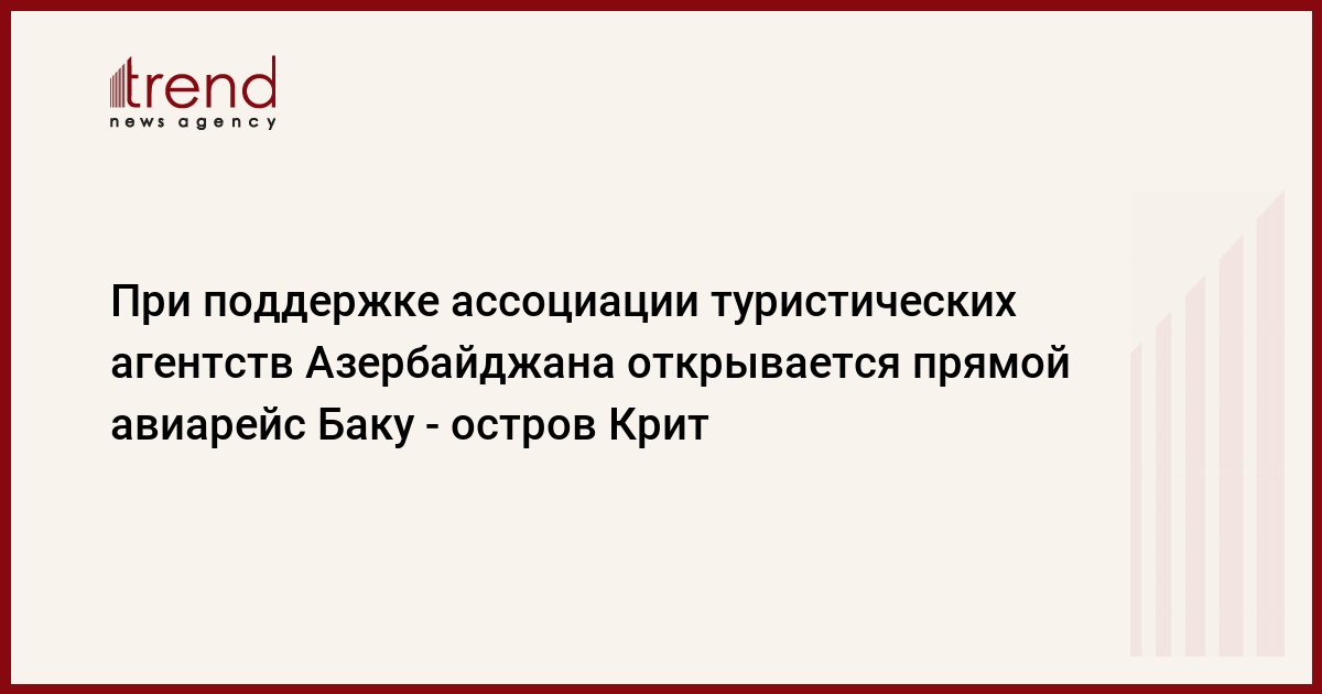 При поддержке Ассоциации туристических агентств Азербайджана открывается прямой рейс Баку - остров Крит (Греция), сказал во вторник президент Ассоциации Нахид Багиров. Перелет будет осуществляться на пассажирском авиалайнере Аэробус-319.