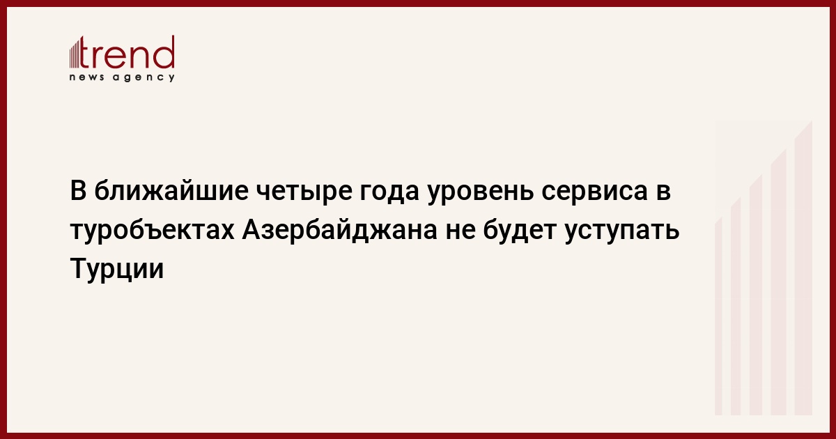 По его словам, в ближайшие три-четыре года, в рамках реализации госпрограммы по развитию туризма в республике на 2010-2014 годы профессиональный уровень оказываемых услуг в туробъектах страны, не будет уступать туробъектам Турции, которая является одним из лидеров мировой туристической индустрии. Госпрограмма была утверждена президентом Азербайджана Ильхамом Алиевым шестого апреля.