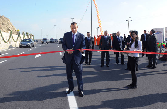 Президент Ильхам Алиев разрезал ленту в знак открытия дороги.