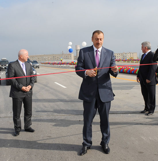 Президент Ильхам Алиев разрезал ленту в знак открытия дороги.
