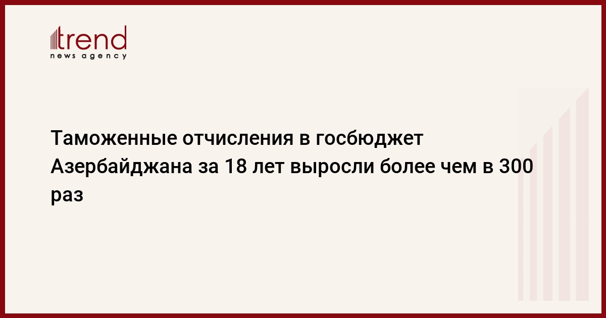 В 2012 году таможенные отчисления в государственный бюджет вырастут почти в 345 раз, по сравнению с 1994 годом, говорится в статье первого заместителя председателя Государственного таможенного комитета Сафара Мехдиева, опубликованной в официальной печати в среду.