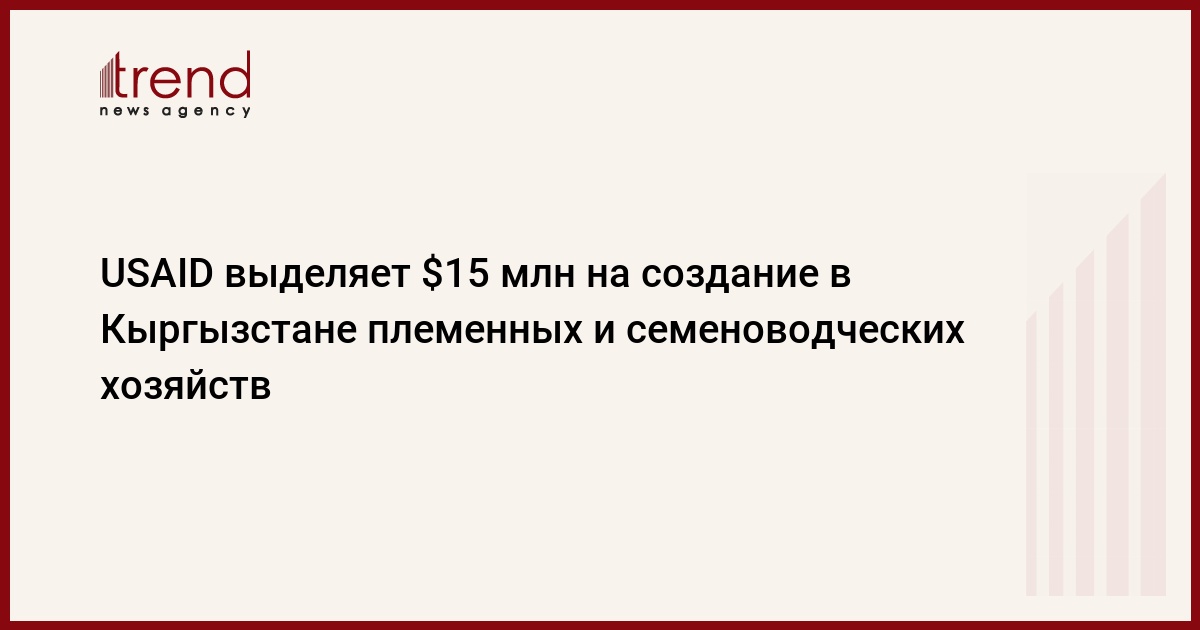 USAID выделяет $15 млн на создание в Кыргызстане племенных и семеноводческих хозяйств. Сообщил министр сельского хозяйства и мелиорации Сапарбек Тынаев на презентации стратегии развития аграрного сектора "Agro ex-15" в понедельник, пишет КирТАГ.