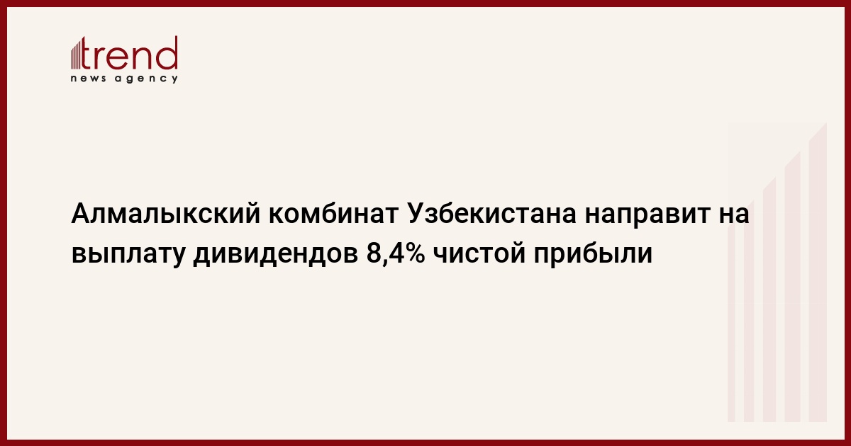 ОАО "Алмалыкский горно-металлургический комбинат" (АГМК, Ташкентская область), крупнейший производитель меди в Центральной Азии, направит на выплату дивидендов по итогам 2011 года 8,4 процентов от общего объема полученной чистой прибыли, говорится в пятницу в сообщении предприятия со ссылкой на решение общего годового собрания акционеров, опубликованном в республиканской прессе.