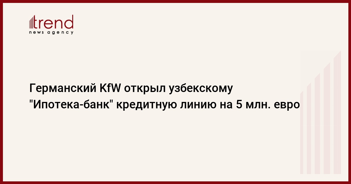 Германский банк развития (Kreditanstalt fur Wiederaufbau (KfW) открыл акционерному коммерческому "Ипотека-банк" Узбекистана кредитную линию на сумму пять миллионов евро для ипотечного кредитования населения, сообщили Trend в среду в руководстве банка.