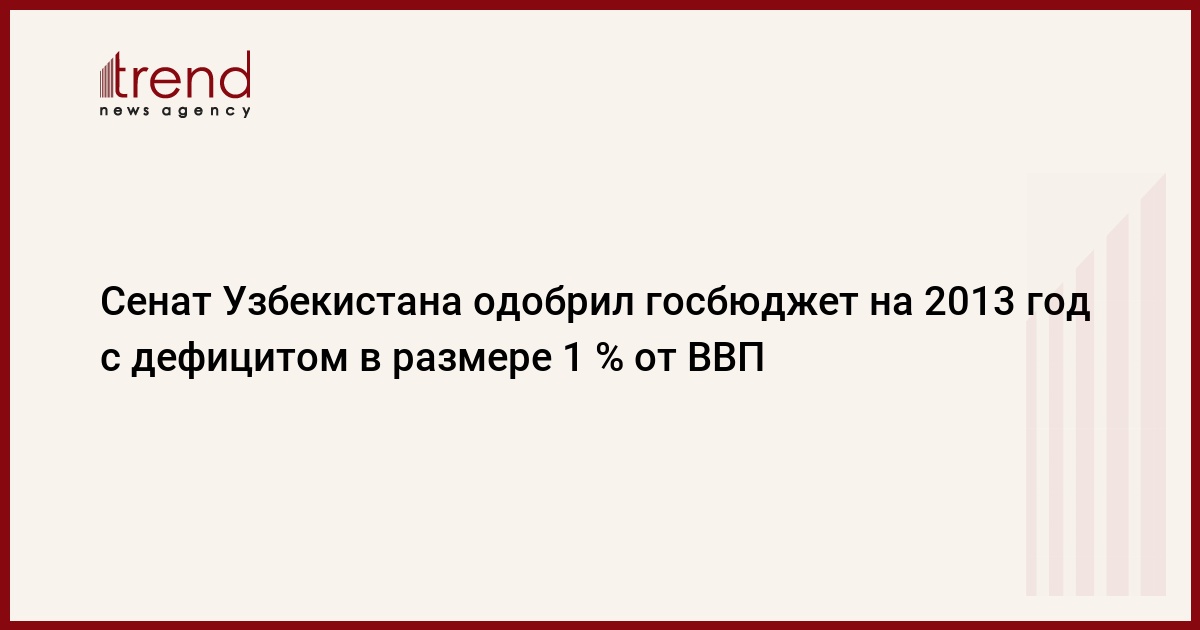 Сенат Олий Мажлиса Узбекистана (верхняя палата узбекского парламента) утвердил в четверг государственный бюджет на 2013 год с дефицитом в 1,2 триллиона сумов, или один процент от прогнозируемого объема внутреннего валового продукта (ВВП).