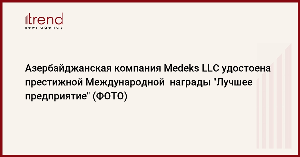 Азербайджанская компания Medeks LLC удостоена престижной Международной награды "Лучшее предприятие", учрежденной Европейской Бизнес-Ассамблеей.