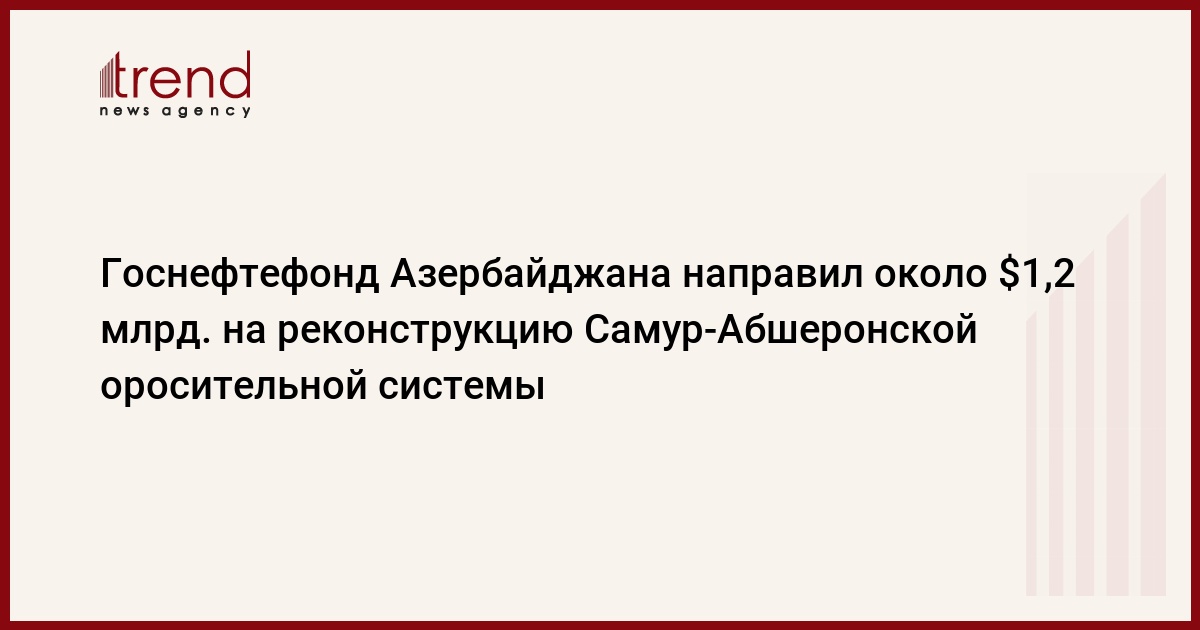 По данным на первое апреля 2013 года, в рамках проекта реконструкции Самур-Абшеронской оросительной системы из Государственного нефтяного фонда Азербайджана (ГНФАР) всего было выделено 922,7 миллиона манатов, говорится в сообщении, размещенном на официальном сайте ГНФАР.