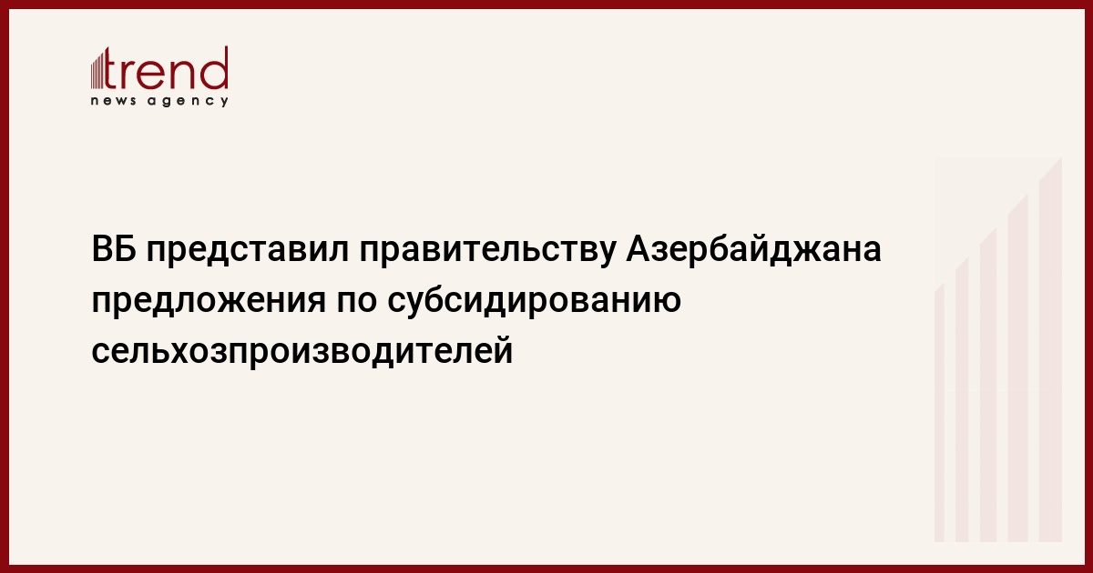 Всемирный банк (ВБ) представил правительству Азербайджана свои предложения в сфере совершенствования в стране механизма субсидирования производителей сельскохозяйственной продукции.