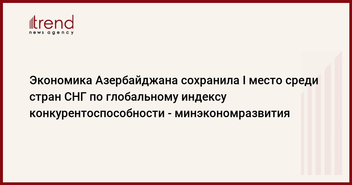 Как сказал Trend в среду глава отдела экономической политики, анализа и прогнозирования министерства экономического развития (МЭР) Азербайджана Адалят Мурадов, комментируя улучшение позиции страны в глобальном рейтинге конкурентоспособности, издаваемом Всемирным экономическим форумом (ВЭФ), в последнем отчете ВЭФ азербайджанская экономика сохранила первое место среди стран СНГ по глобальному индексу конкурентоспособности.