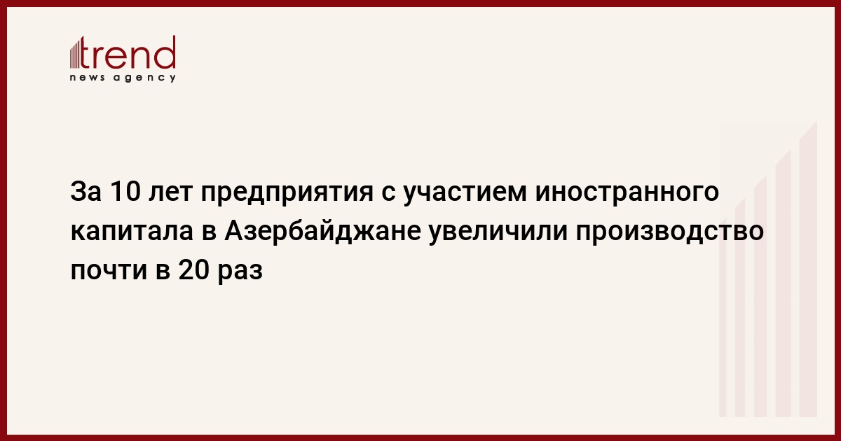 Предприятия с участием иностранного капитала, работающие в Азербайджане, за последние 10 лет увеличили объем производства своей продукции в 19,8 раза.