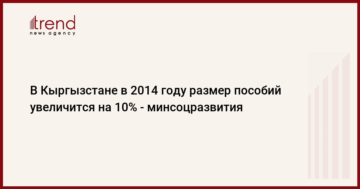 В Кыргызстане в 2014 году размер пособий увеличится на 10%, об этом КирТАГ сообщили в пресс-службе министерства социального развития КР.