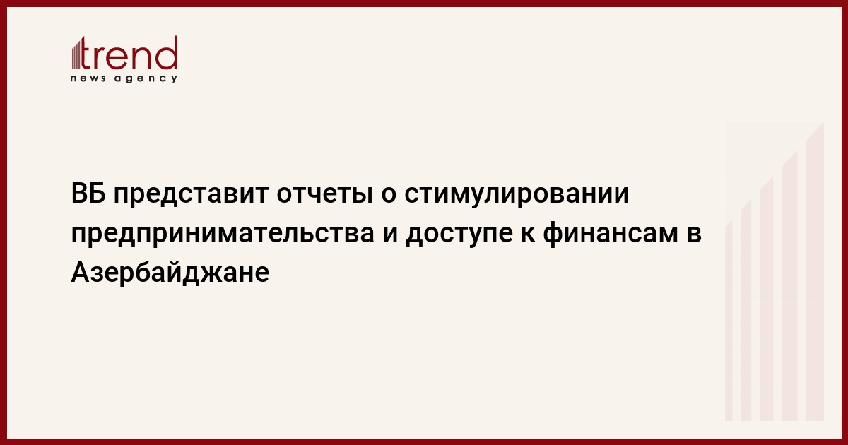 В понедельник Всемирный банк (ВБ) представит правительству Азербайджана отчеты о доступе к финансированию и стимулировании предпринимательства в стране, сообщили Trend в пятницу в бакинском представительстве ВБ.