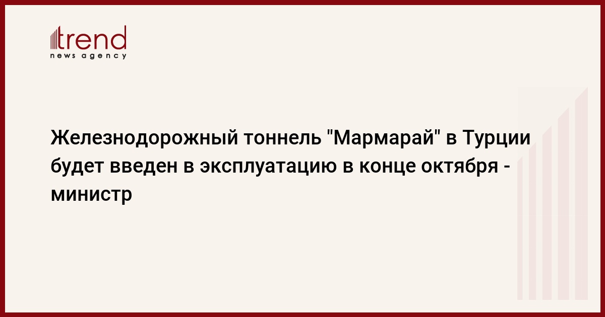 Железнодорожный тоннель "Мармарай", который свяжет азиатскую часть Стамбула с европейской, будет введен в эксплуатацию 29 октября, заявил министр транспорта, судоходства и коммуникаций Турции Бинали Йылдырым, сообщает в четверг агентство "Anadolu".