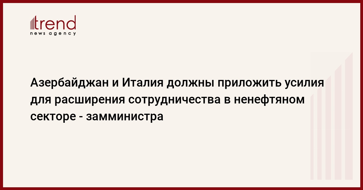 Италия, по его словам, является основным внешнеторговым партнером страны. Товарооборот между Азербайджаном и Италией по итогам 2012 года составил 5,8 миллиарда долларов, а за девять месяцев текущего года внешнеторговые операции между странами были осуществлены на 4,6 миллиарда долларов.