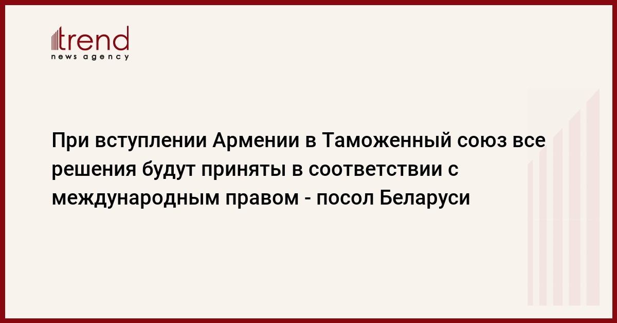 Любые вопросы, связанные со вступлением Армении в Евразийский таможенный союз, будут внимательно рассмотрены, и все решения будут приняты в соответствии с международным правом, сказал во вторник журналистам в Баку посол Беларуси в Азербайджане Николай Пацкевич.