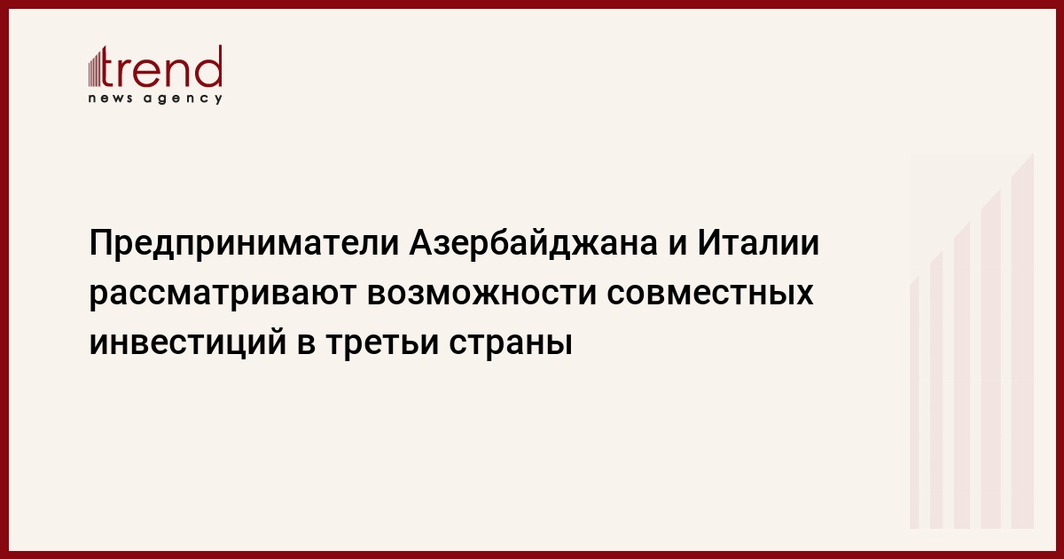 Азербайджанские и итальянские компании рассматривают возможности для совместного инвестирования в третьих странах - Казахстане, России, Иране и других. Об этом сказал журналистам в четверг президент Национальной конфедерации предпринимателей Азербайджана Мамед Мусаев.