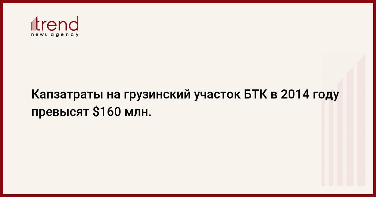 Согласно проекту бюджета ООО "Железная дорога Марабда-Карцахи", которое является оператором строительства грузинского участка железной дороги Баку-Тбилиси-Карс (БТК), общий объем расходов на реализацию проекта в 2014 году составит 170 миллионов долларов.