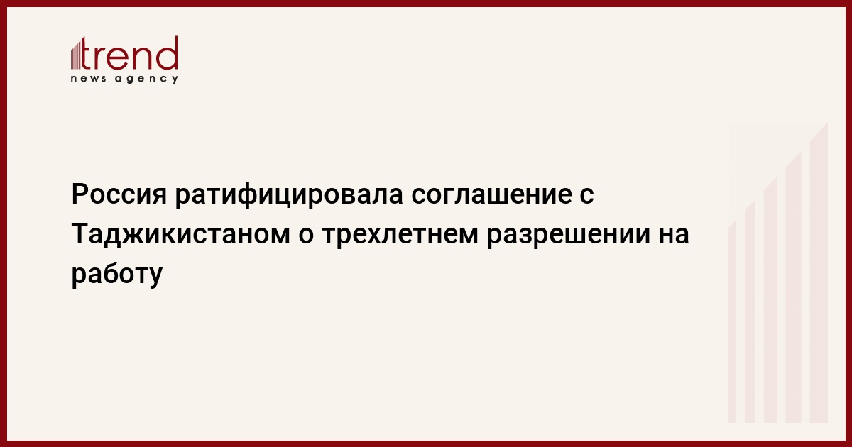 Совет Федерации ратифицировал в среду протокол о внесении поправок в российско-таджикское межправсоглашение о трудовой деятельности и защите прав граждан двух стран, в частности, документ дает право получать разрешение на работу не на один, а на три года, передает РИА Новости.