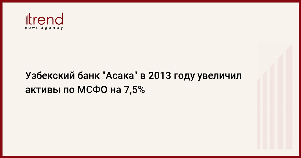 Государственно-акционерный коммерческий банк (ГАКБ) "Асака", второй по размеру основных банковских показателей в банковской системе Узбекистана, в 2013 году увеличил активы, рассчитанные по международным стандартам финансовой отчетности (МСФО), на 7,5 процента - до 4,543 триллиона сумов, согласно опубликованному в СМИ балансовому отчету банка.