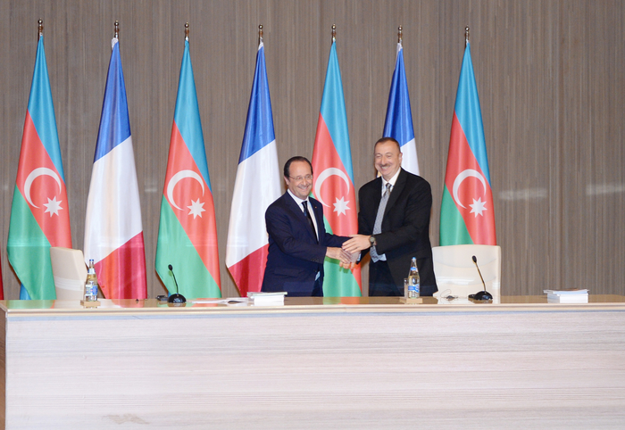 Президент Азербайджана Ильхам Алиев и Президент Франции Франсуа Олланд принимают участие в проходящем в Баку в понедельник азербайджано-французском бизнес-форуме.