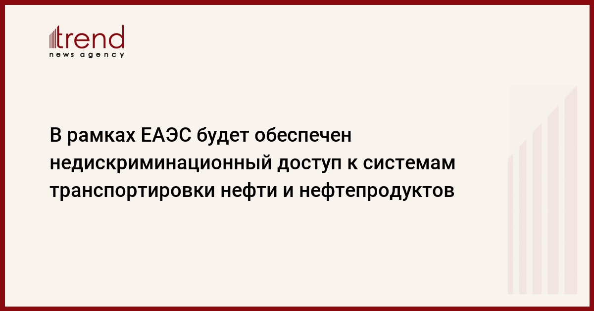 По его словам, государства-члены ЕАЭС разработают единые правила доступа к системам транспортировки нефти и нефтепродуктов, включающие единую методику определения технической возможности транспортировки нефти и нефтепродуктов по трубопроводам, расположенным на территориях государств-членов союза, на основании которых обеспечивают недискриминационный доступ к системам транспортировки нефти и нефтепродуктов.