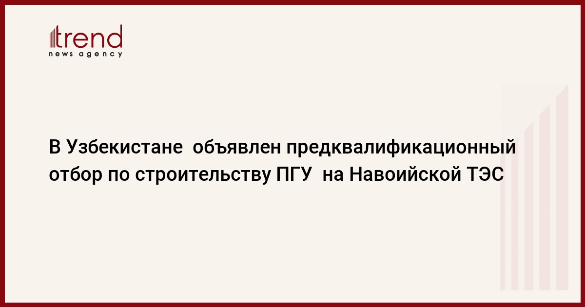 ТАШКЕНТ /Trend/ - Государственная акционерная компания (ГАК) "Узбекэнерго" объявила предварительный квалификационный отбор по проекту строительства "под ключ" одного блока парогазовой установки (ПГУ) комбинированного цикла мощностью 450 МВт на Навоийской тепловой электростанции.