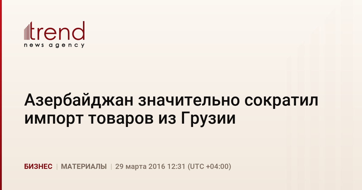 БАКУ /Trend/ - В январе-феврале 2016 года Азербайджан сократил импорт товаров из Грузии более чем в 4,5 раза - до 10,1 миллиона долларов - по сравнению с январем-февралем 2015 года, говорится в отчете Национальной статистической службы Грузии.