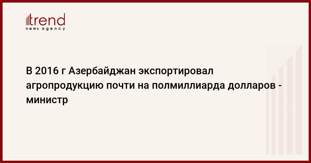 БАКУ /Trend/ - В 2016 году Азербайджан экспортировал агропродукции на 426 миллионов долларов США, что на 73 миллиона долларов, или 20,7 процентов больше показателя 2015 года, сказал министр сельского хозяйства Гейдар Асадов на конференции, посвященной итогам третьего года реализации "Государственной программы социально-экономического развития регионов Азербайджана на 2014-2018 годы".