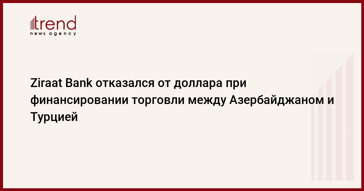 БАКУ /Trend/ - Ziraat Bank Azerbaijan отказался от расчётов в долларах при финансировании торговых операций между Азербайджаном и Турцией, сказал председатель правления банка Авни Демирчи в интервью журналу "Is Dunyamiz", учреждённому общественным объединением "Предприниматели и промышленники Турции и Азербайджана" (TUIB).