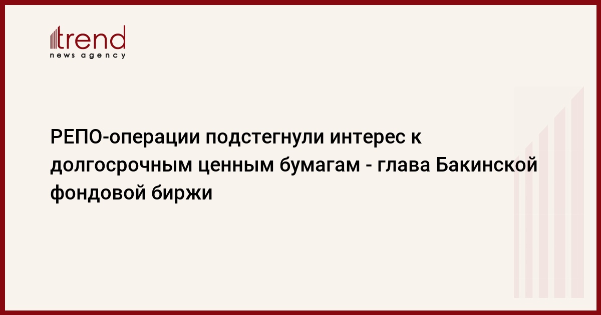БАКУ /Trend/ - Внедрение РЕПО-операций на Бакинской фондовой бирже (БФБ) стимулировало развитие рынка корпоративных ценных бумаг в целом и подстегнуло интерес к долгосрочным ценным бумагам, сказал в интервью Trend председатель правления БФБ Вугар Намазов.